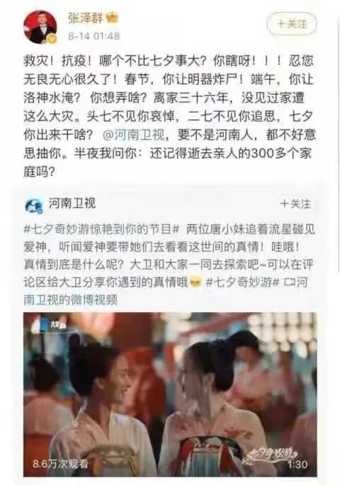 8月14日凌晨,央视河南籍主持人张泽群发文,怒批河南卫视七夕节目,称“忍您无良无心很久了!”
