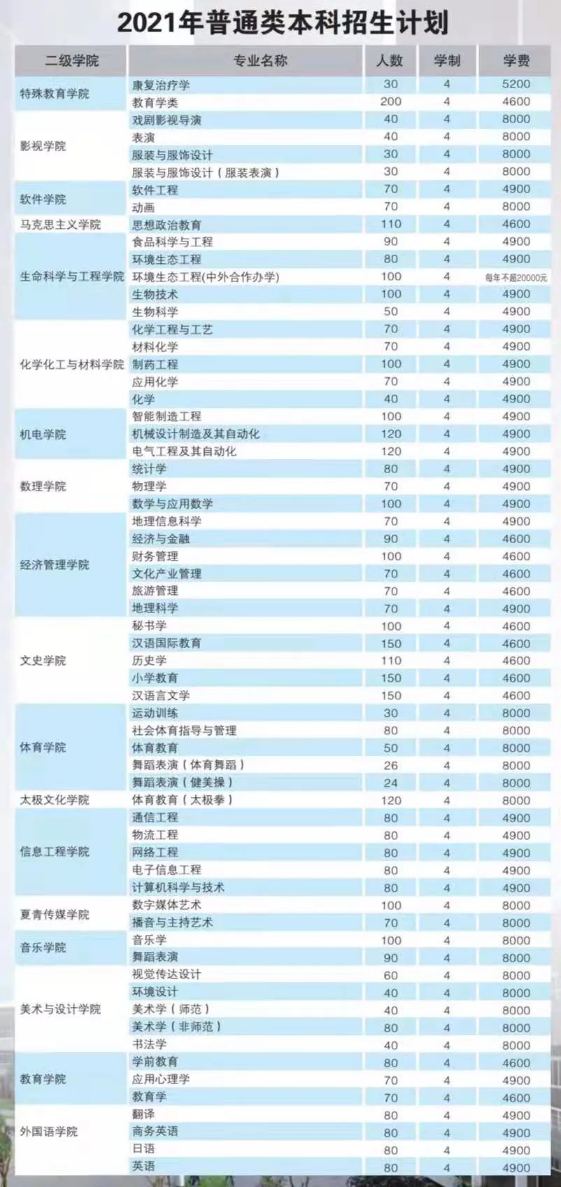 2021年普通类本科招生计划