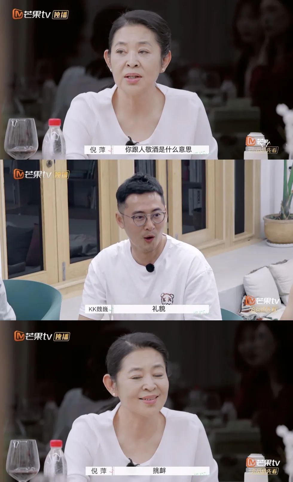KK提到了一次佟晨洁带着自己去参加婚礼,偶遇了她的前夫,KK为了宣示主权跑去跟佟晨洁的前夫敬酒,还要说这么做是因为“礼貌”,倪萍直接拆穿: