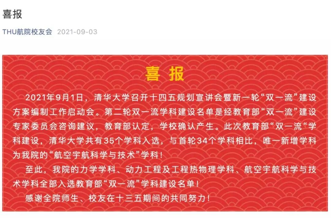 9月3日,“THU航院校友会”发布《喜报》称,清华大学共有35个学科入选第二轮“双一流”学科建设名单,本轮新增了“航空宇航科学与技术”学科。
