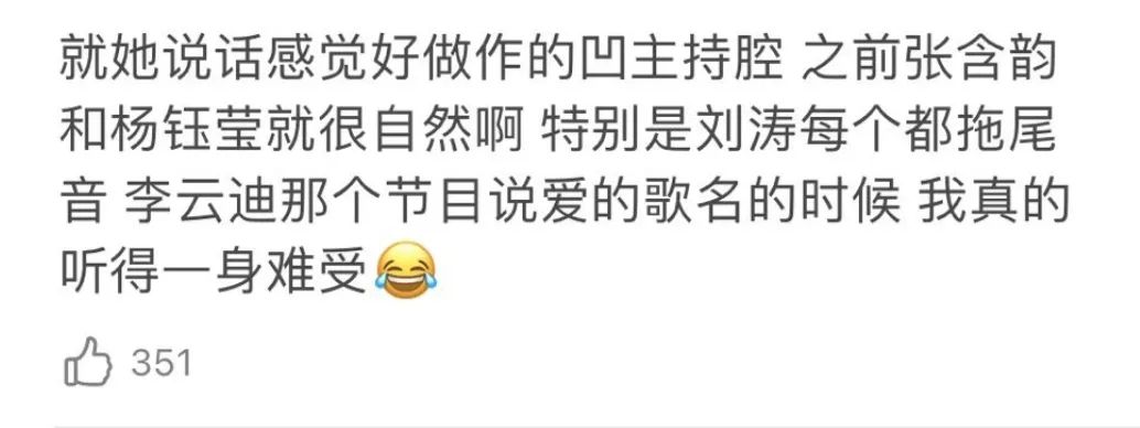 刘涛这样拖长音,大概是为了刻意凹主持腔,为了让人觉得她专业,但这样反而不自然,让观众听得很难受。