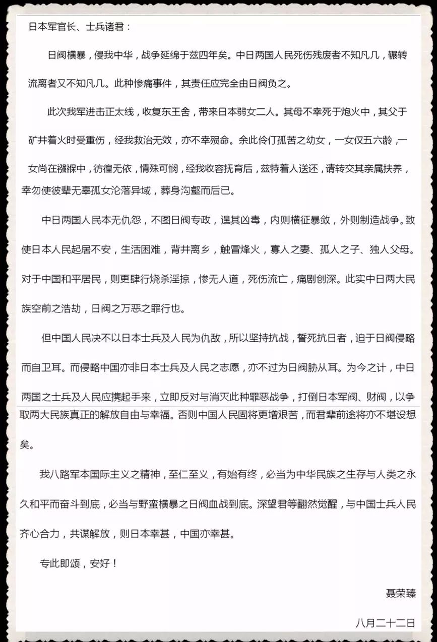这是聂荣臻写给日本侵略者的信,一封充满传奇的信,一封原件虽散佚、手抄件却在日本友人间流传的信。