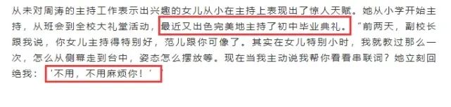 周涛还透露,女儿香香从小就在主持方面展现出惊人的天赋,上学期间一直在做各种各样的主持活动,现在主持也经常自己修改台词和调整主持姿势。副校长称赞她主持时像母亲一样,大气有气质,完全不怯场。