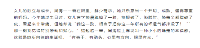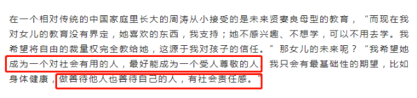 周涛还分享了自己的为母之道——尊重孩子的个性,给自由成长的空间。不要勉强拒绝孩子的东西,充分支持孩子的兴趣,母子之间完全信赖和鼓励。周涛对女儿未来的期望也与成绩名利无关,只希望女儿成为善良、受人尊敬、有社会责任感的人。