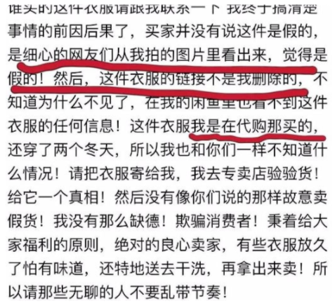 她还曾回应说衣服也是从代购那买的,自己也不清楚是真货还是假货,