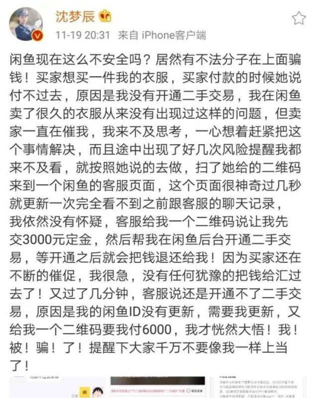 2018年,沈梦辰发微博详细讲诉了自己在闲鱼上的被骗经历,