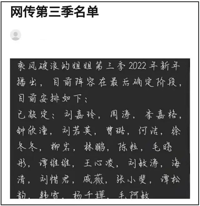 有网友爆料称自己得到了一份《乘风破浪的姐姐3》的参赛选手名单,这也让网友们觉得非常好奇心。从该网友曝出的名单看来,刘嘉玲,毛阿敏和周涛等知名女星的名字赫然在列。而刘嘉玲更是意味着港星的高水平。