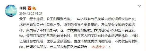何炅发文表示以后不会再收任何礼物,从他发文的内容来看他道歉非常诚恳