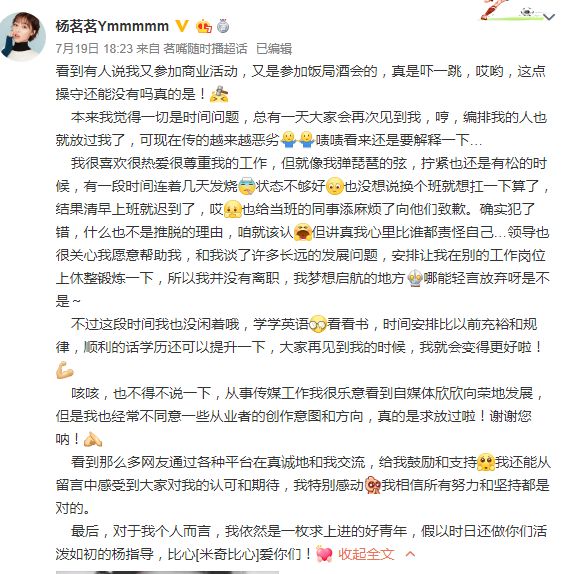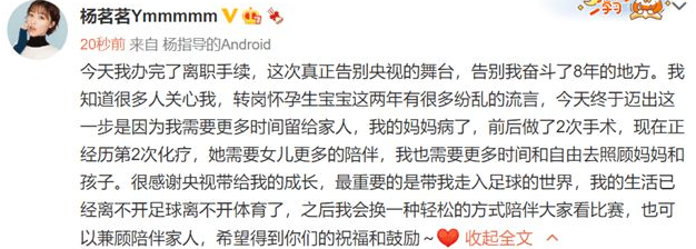 随后杨茗茗否认离开央视,表示当时只是被领导安排调休。“领导也很关心我愿意帮助我,和我谈了许多长远的发展问题,安排让我在别的工作岗位上休整锻炼一下,所以我并没有离职,我梦想启航的地方 哪能轻言放弃呀是不是?”