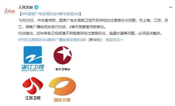 近日,广电总局约谈了湖南卫视、浙江卫视、东方卫视、江苏卫视。这4家电视台积极推动媒体深度融合发展,在弘扬主流价值观、传播正能量方面作出了积极贡献。但各卫视频道也不同程度地存在过度娱乐化、追星炒星等问题,必须坚决整改。