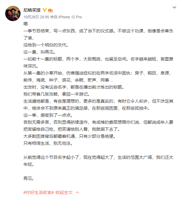 尼格买提在结束信中写的那样告别无需多言,否则显得矫揉造作,有成堆的委屈。想跟你们说,但都说成年人都把苦留给自己吃,把笑言给别人看,简简单单却又很真实的话语,不知看哭了多少人。