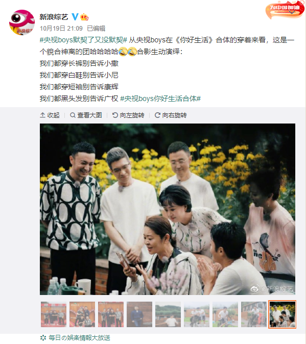 在《你好生活》最后一期节目播出的前9天,新浪综艺官微还曾发文预告了央视boys康辉、撒贝宁、朱广权以及尼格买提四人合体的消息,同时曝光了5张照片,是一组央视boys的合照,照片中他们有的搞怪,有的大笑,让人感受到他们之间亲密的友情。