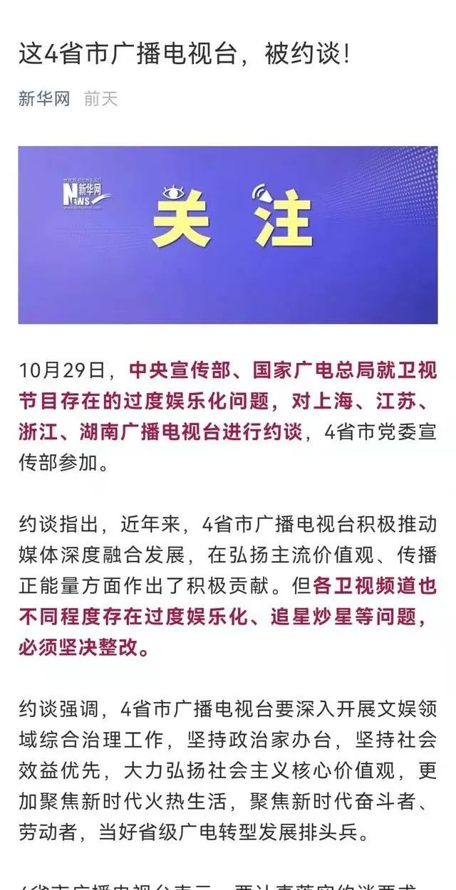 约谈中强调:这4家电视台要深入开展文娱领域综合治理工作,坚持政治家办台,坚持社会效益优先,大力弘扬社会主义核心价值观,更加聚焦新时代火热生活,聚焦新时代奋斗者、劳动者,当好省级广电转型发展排头兵。