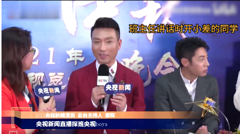 视频中,康辉在一本正经的讲话,撒贝宁像个“小学生”坐不住一样。