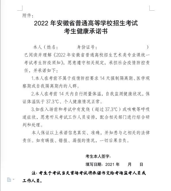 如实完整填写《2022年安徽省普通高等学校招生考试考生健康承诺书》(简称《承诺书》)(见附件)。