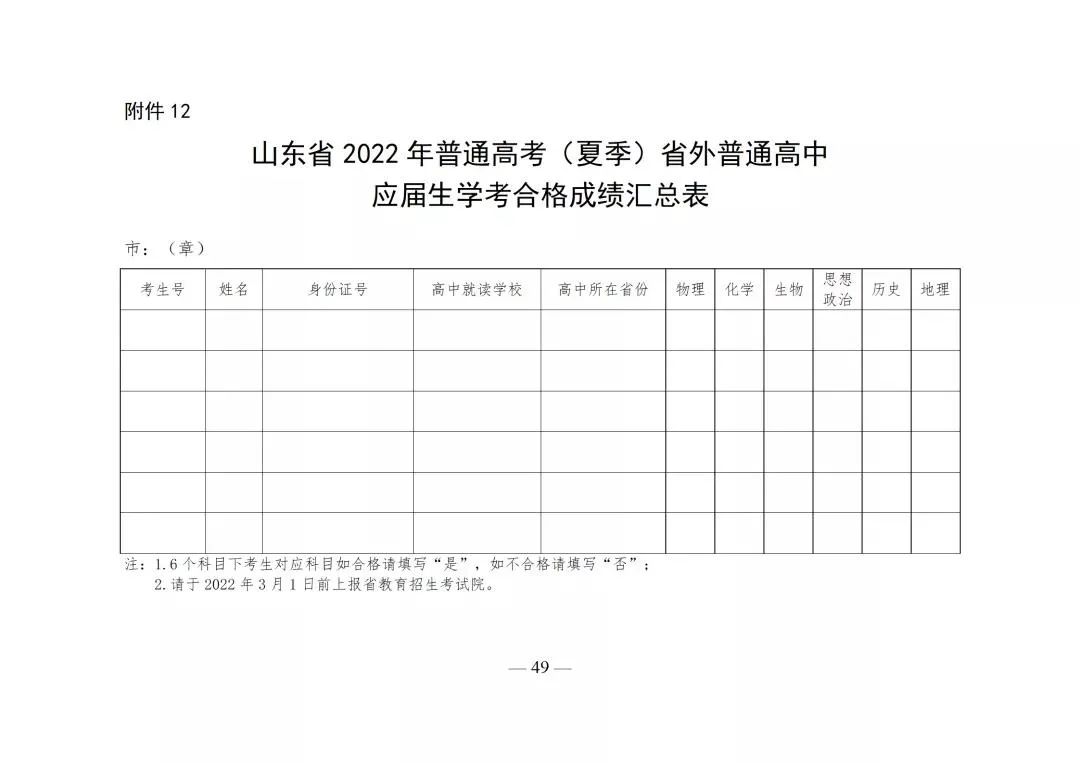 附件12:山东省2022年普通高考(夏季)省外高中应届生学考合格成绩汇总表