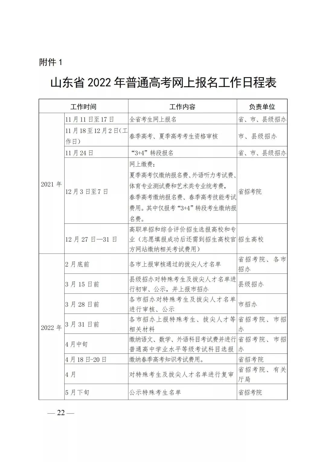 附件1:山东省2022年普通高考网上报名工作日程表