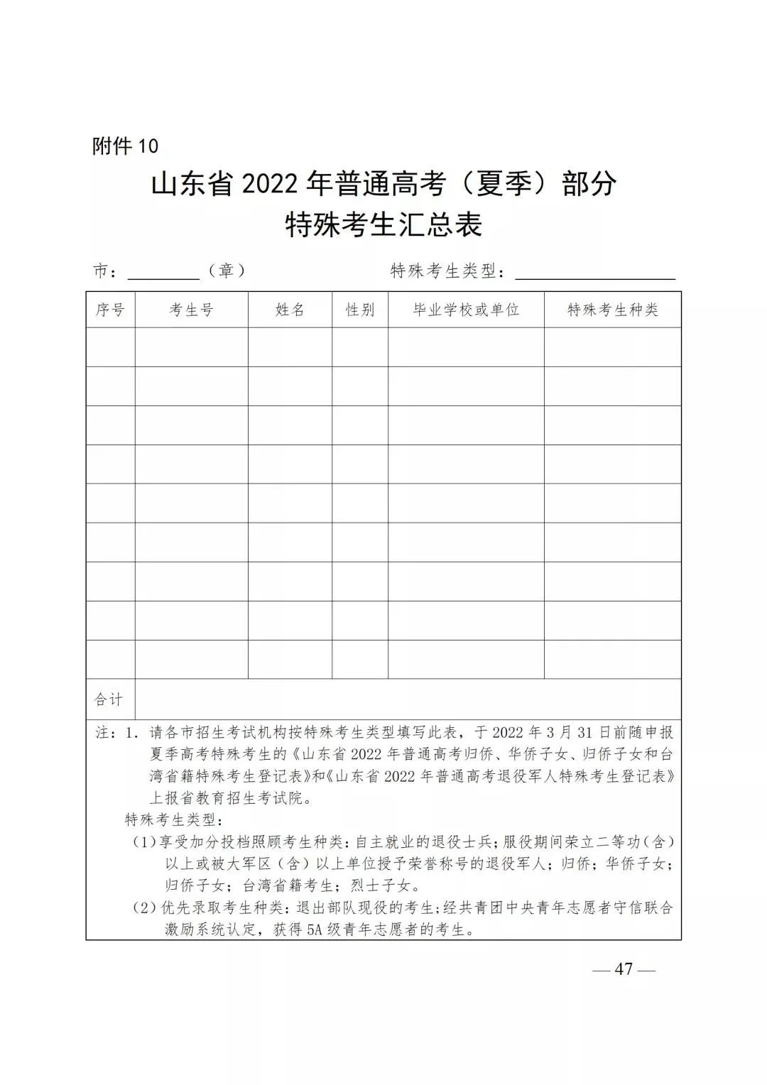 10.山东省2022年普通高考(夏季)部分特殊考生汇总表