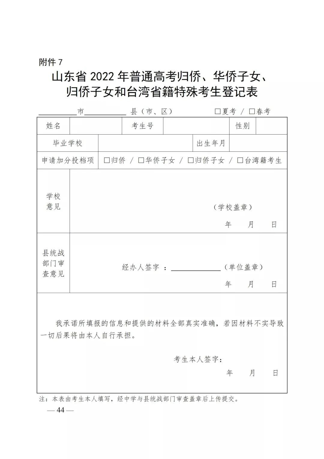 附件7:山东省2022年普通高考归侨、华侨子女、归侨子女和台湾省籍特殊考生登记表