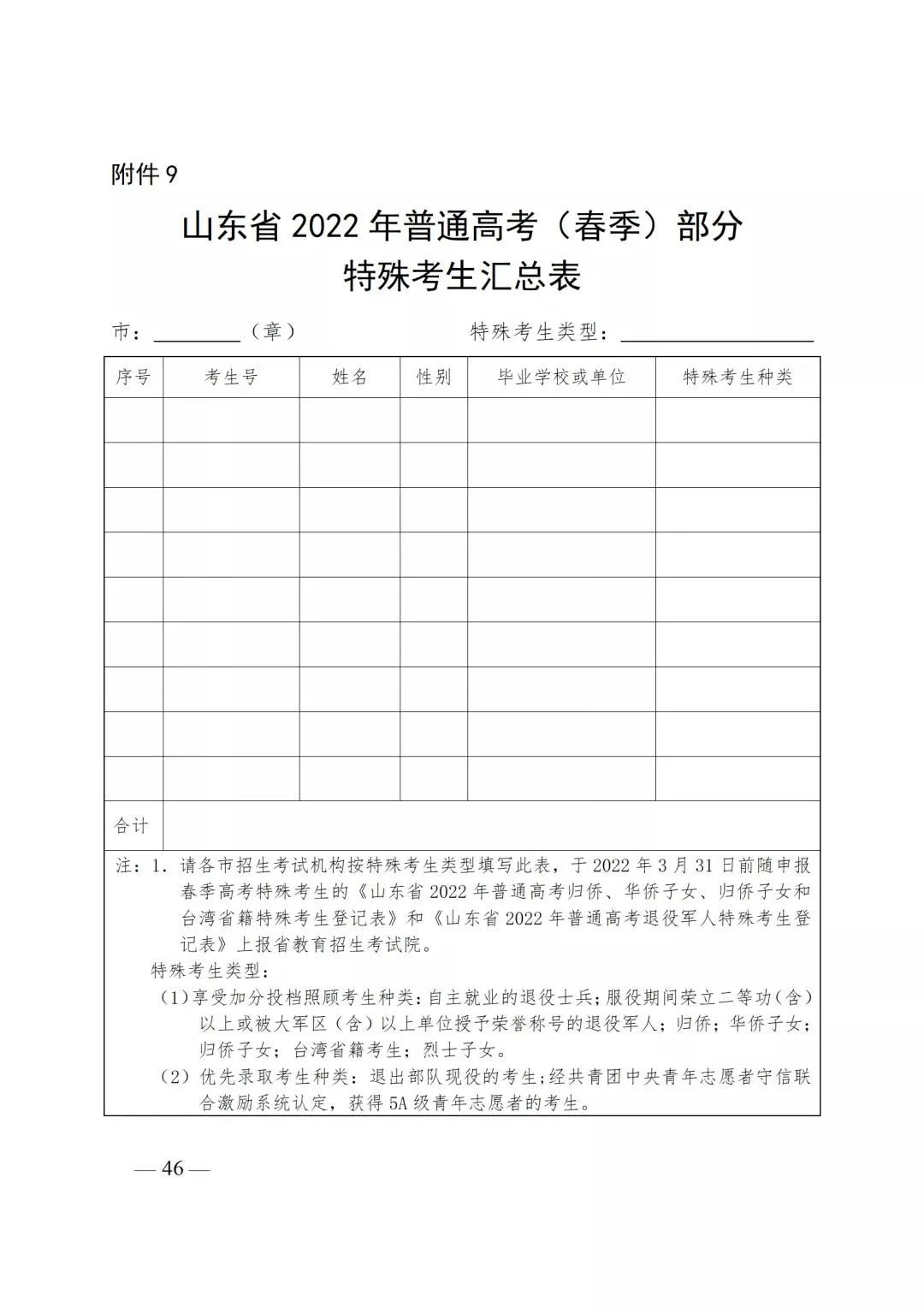 附件9:山东省2022年普通高考(春季)部分特殊考生汇总表