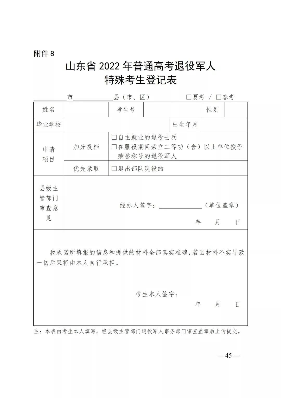 (1)申报。相关考生要填写《山东省2022年普通高考退役军人特殊考生登记表》(附件8),经县级主管部门退役军人事务部门盖章后,本人签字承诺申报内容属实。在网上填报信息时应上传《登记表》、退役证、自主就业证明或立功证明。