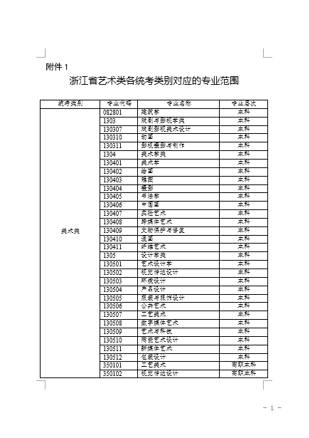 附件1 浙江省艺术类各统考类别对应的专业范围