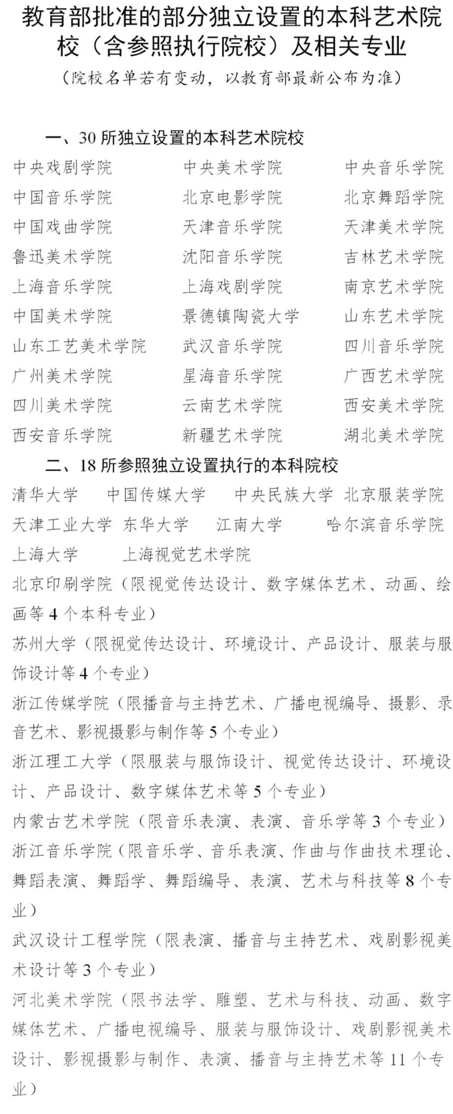 5.对于美术学类和设计学类专业,除经教育部批准的部分独立设置的本科艺术院校(含部分艺术类本科专业参照执行的少数高校)外,高校不再组织校考。