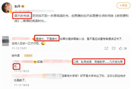 有网友发文称口误、乱用成语、写错别字等问题在朱丹的身上几乎成为了常态,