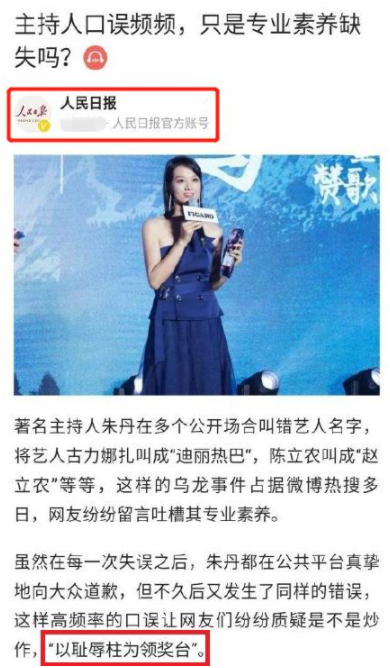 朱丹因负面消息被网友关注的同时,也受到了官方媒体《人民日报》的点名批评,官媒表示朱丹道歉又失误的做法完全是把“耻辱柱当成了领奖台”。