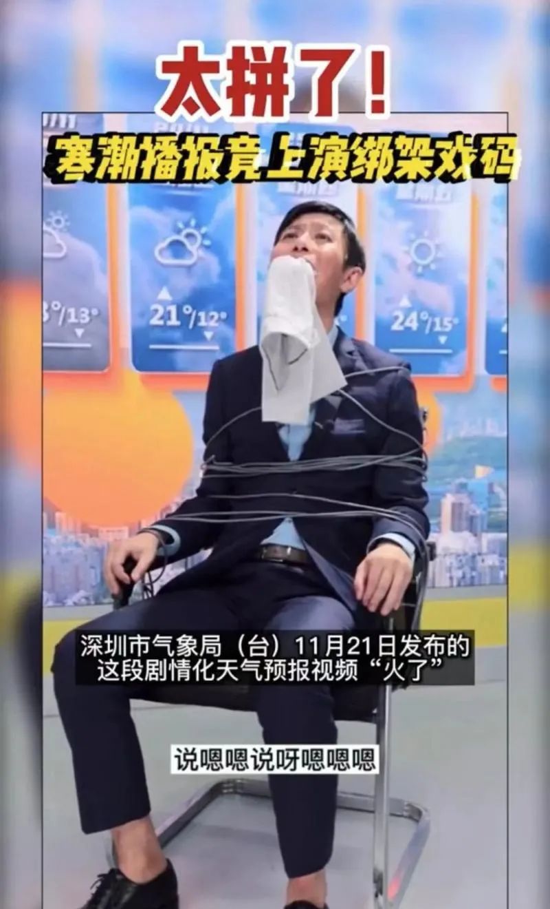视频中,一男子质问被“绑”在椅子上的气象预报员——