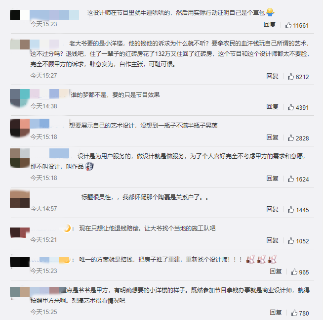 不少观众代入自身,如果花了132万,房子被设计师改成这样,应该会当场翻脸。不少网友喊话建筑公司退钱,认为设计是为了实现自己的设计理念,没有充分考虑到业主的个人意愿、生活所需和预算成本。