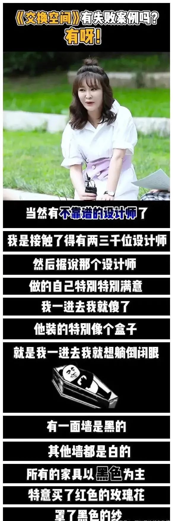 她说:“我是带期待进去的,可是一进去我的我都已经傻眼了,就是设计师装的特别像盒子那种盒子,就是我一进去就想我躺倒闭眼的那种盒子,设计师还特意买了玫瑰花,玫瑰花的外面罩了黑色的纱。当时一看我就懵了,我觉得要是不开彩灯,那就是一个盒子,就很有棺材感,开了彩灯就特别像个大包间。”