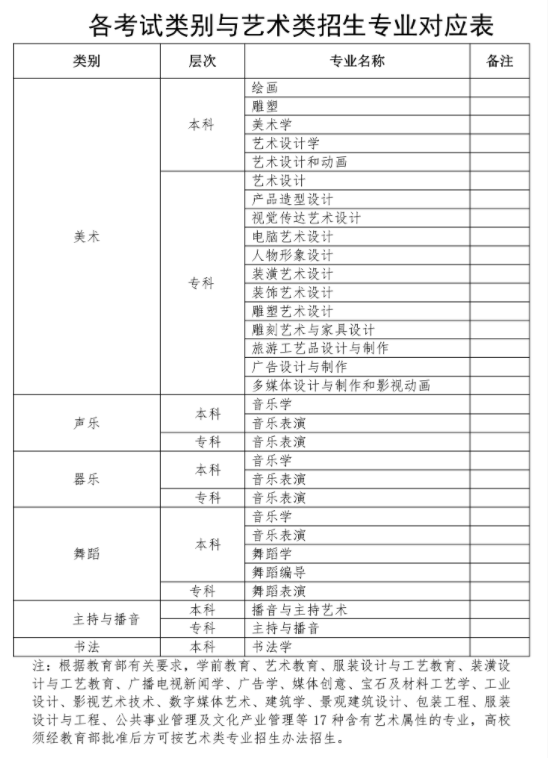 1.各考试类别与艺术类招生专业对应表