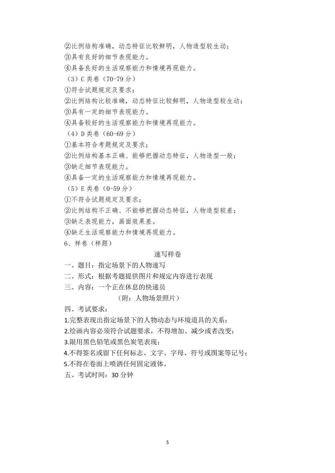 5.笔试科目考试开考信号发出之前不准答卷或绘画;开考15分钟后迟到的考生不准进入考场,考试终了前30分钟才准交卷离场(速写考试除外)。