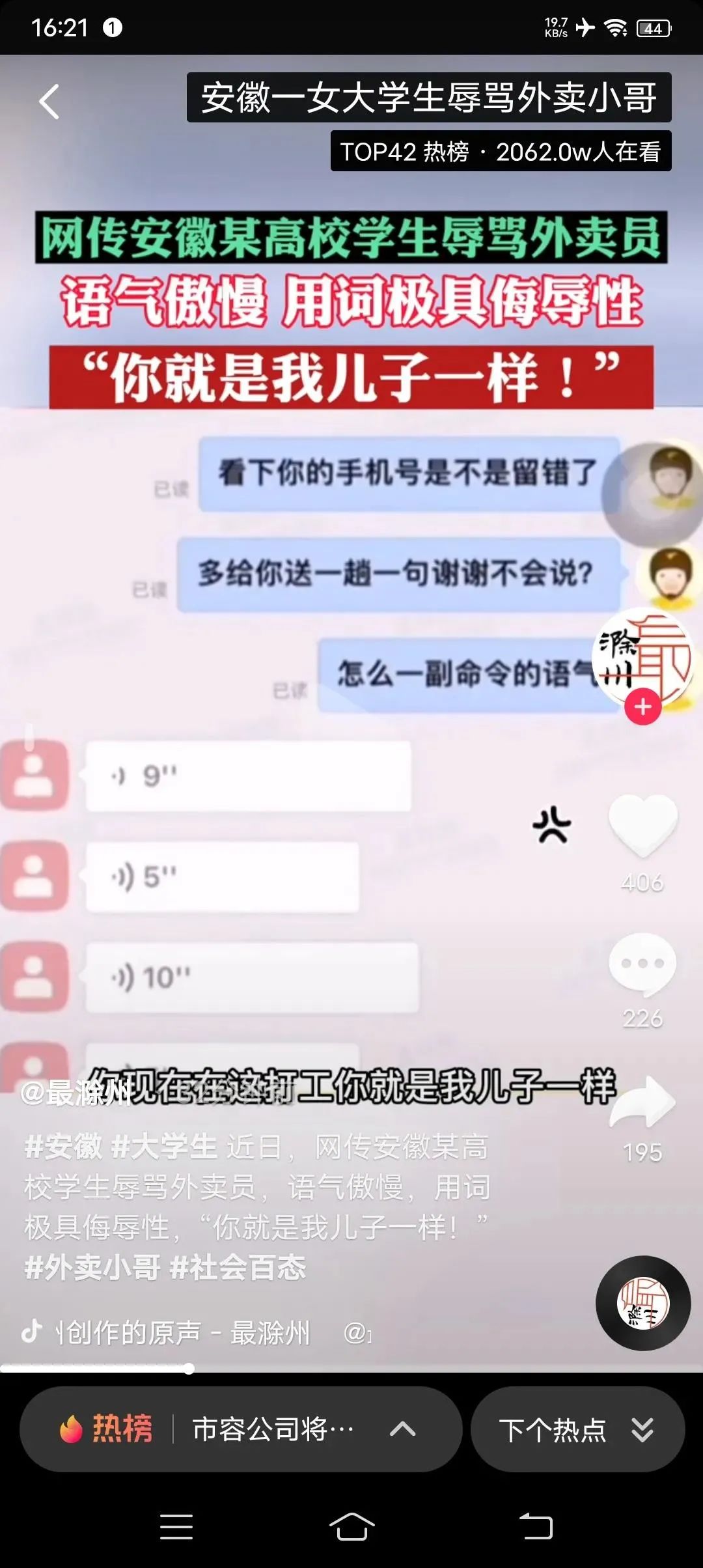 近日,安徽某女大学生辱骂外卖员的视频在网上引起广泛关注。据悉,女大学生叫了外卖,但因自己把手机号码写错,导致外卖员无法正常配送此单。外卖员在线留下自己的联系方式,女生打电话要求外卖员再次配送,外卖员在送到后希望女生能说声谢谢,结果引来了该女生的辱骂。对于此事,学校回应,女生当时已道歉且外卖员也接受了,外卖员表示自己不会把视频上传到网上。同时表示女孩是新生,学校希望网络舆论对女孩宽容一点,给她一个改正错误的机会。并表示因为此事,学校后续会开展三观教育。
