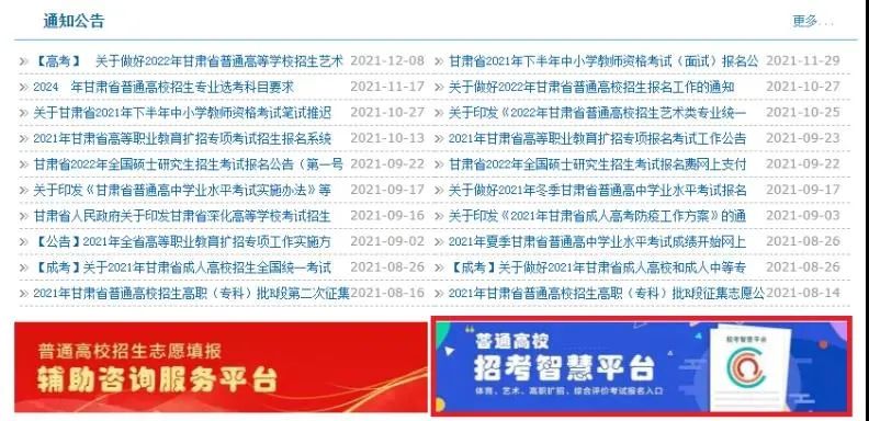 2.点击“通知公告”栏目下方的“甘肃省普通高校招考智慧平台”。