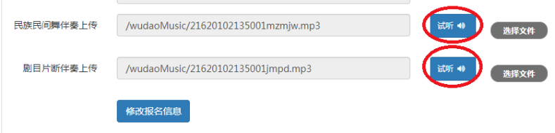 10.报名舞蹈类统考的考生,请于报名页面下方上传考试时所使用的伴奏曲目,上传完毕后务必点击“试听”按钮进行试听,确保上传曲目可播放及其完整性。