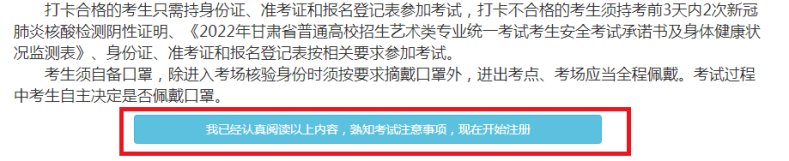 打卡合格的考生只需持身份证、准考证和报名登记表参加考试,打卡不合格的考生须持考前3天内2次新冠肺炎核酸检测阴性证明、《2022年甘肃省普通高校招生艺术类专业统一考试考生安全考试承诺书及身体健康状况监测表》、身份证、准考证和报名登记表按相关要求参加考试。