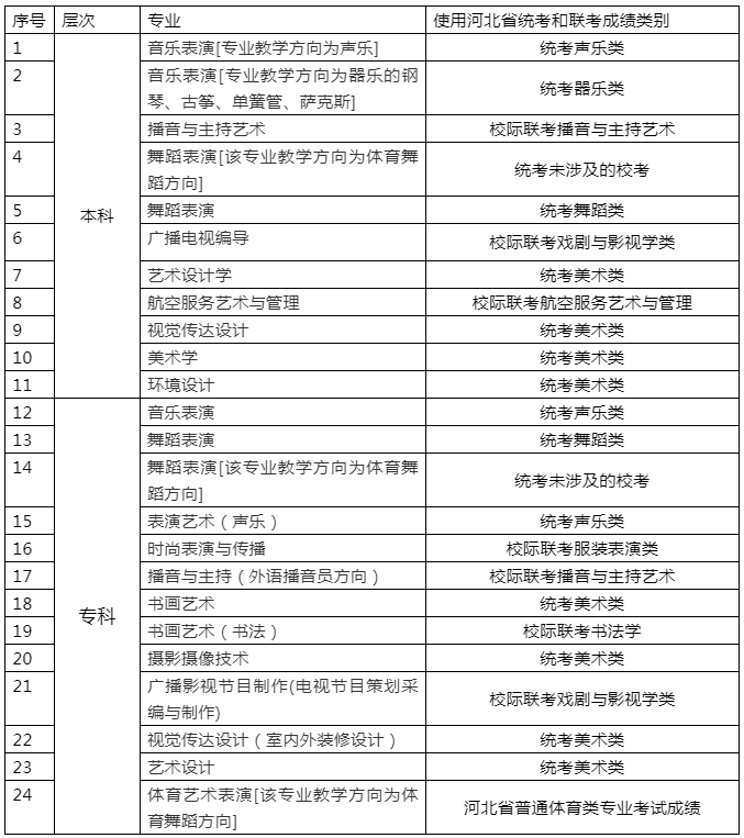 七、学院艺术类专业、招生计划、使用河北省统考和联考成绩对应表: