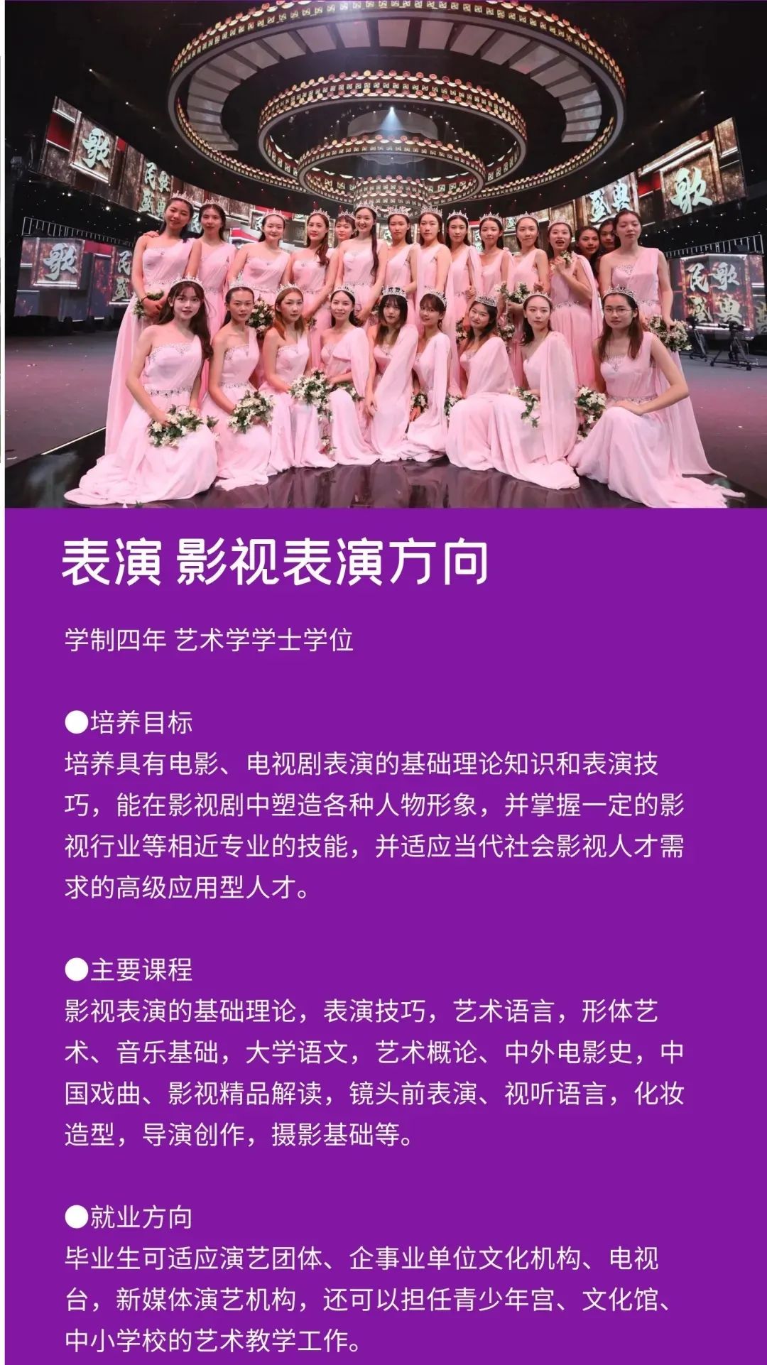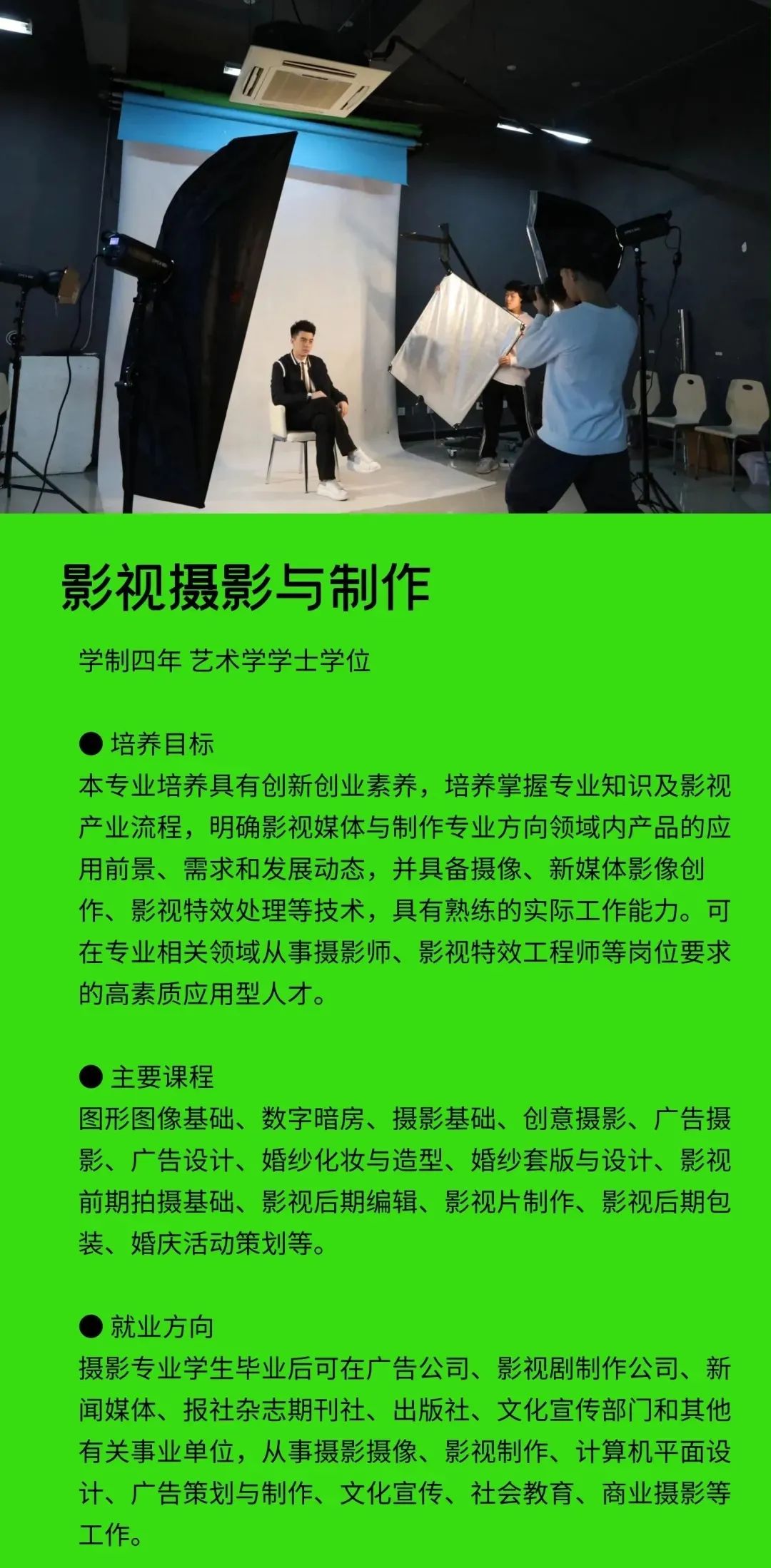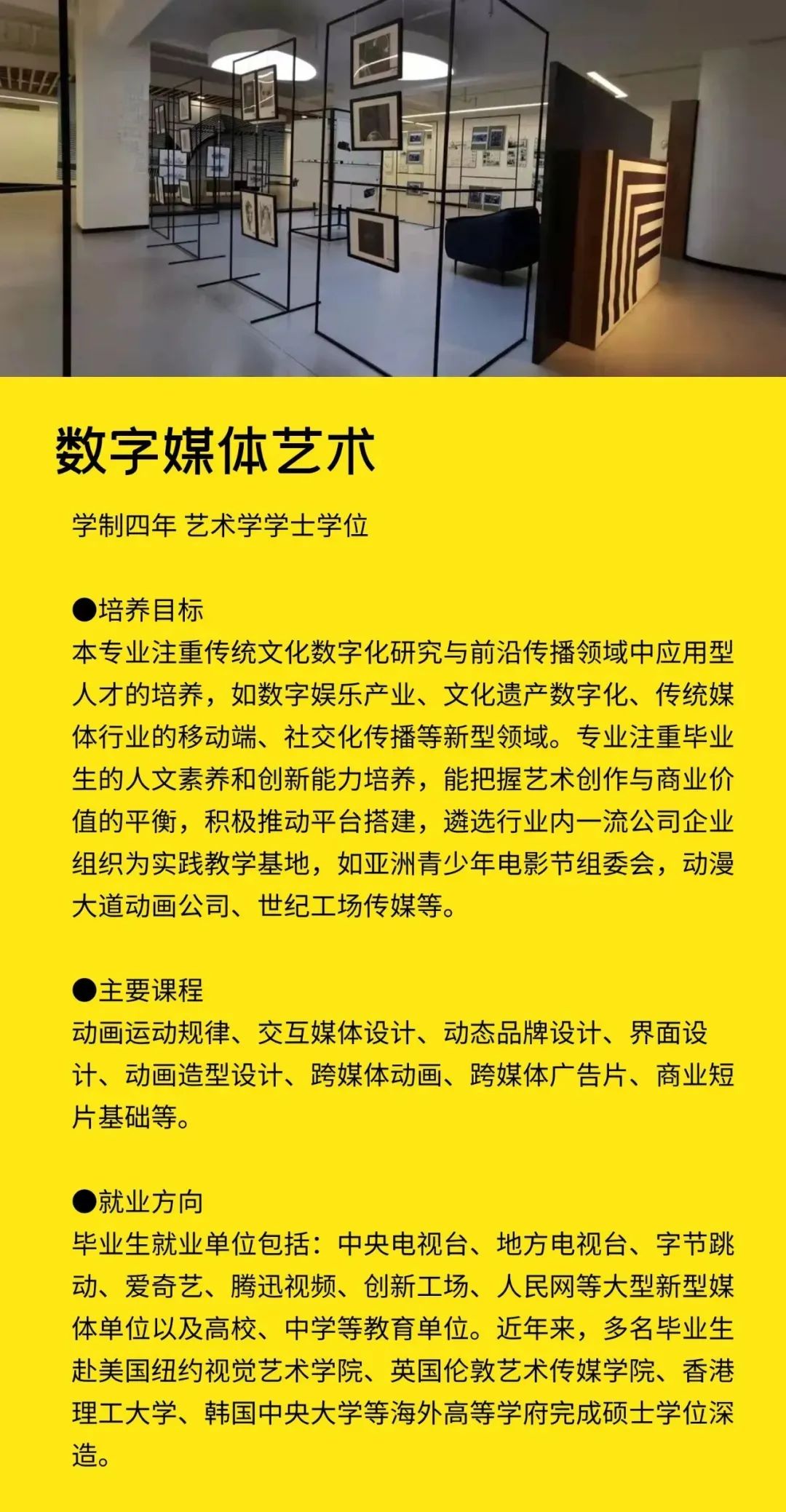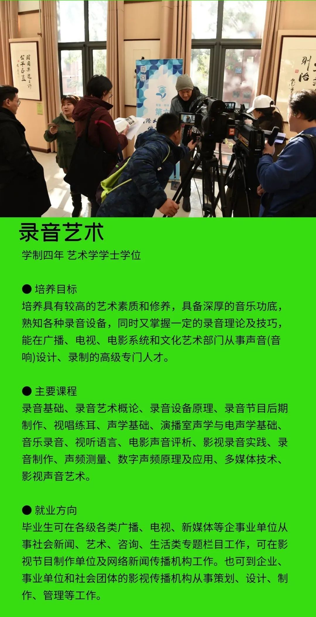 学校定位于打造一所与众不同的艺术院校,以多门艺术学科交叉融合为突破口,设置会展经济与管理、学前教育、广播电视编导、播音与主持艺术、摄影、表演、艺术设计学、视觉传达设计、环境设计、书法学、录音艺术等专业,形成了艺术与现代传媒、数字创意产业紧密融合的专业群,凸显艺术学门类的学科优势。