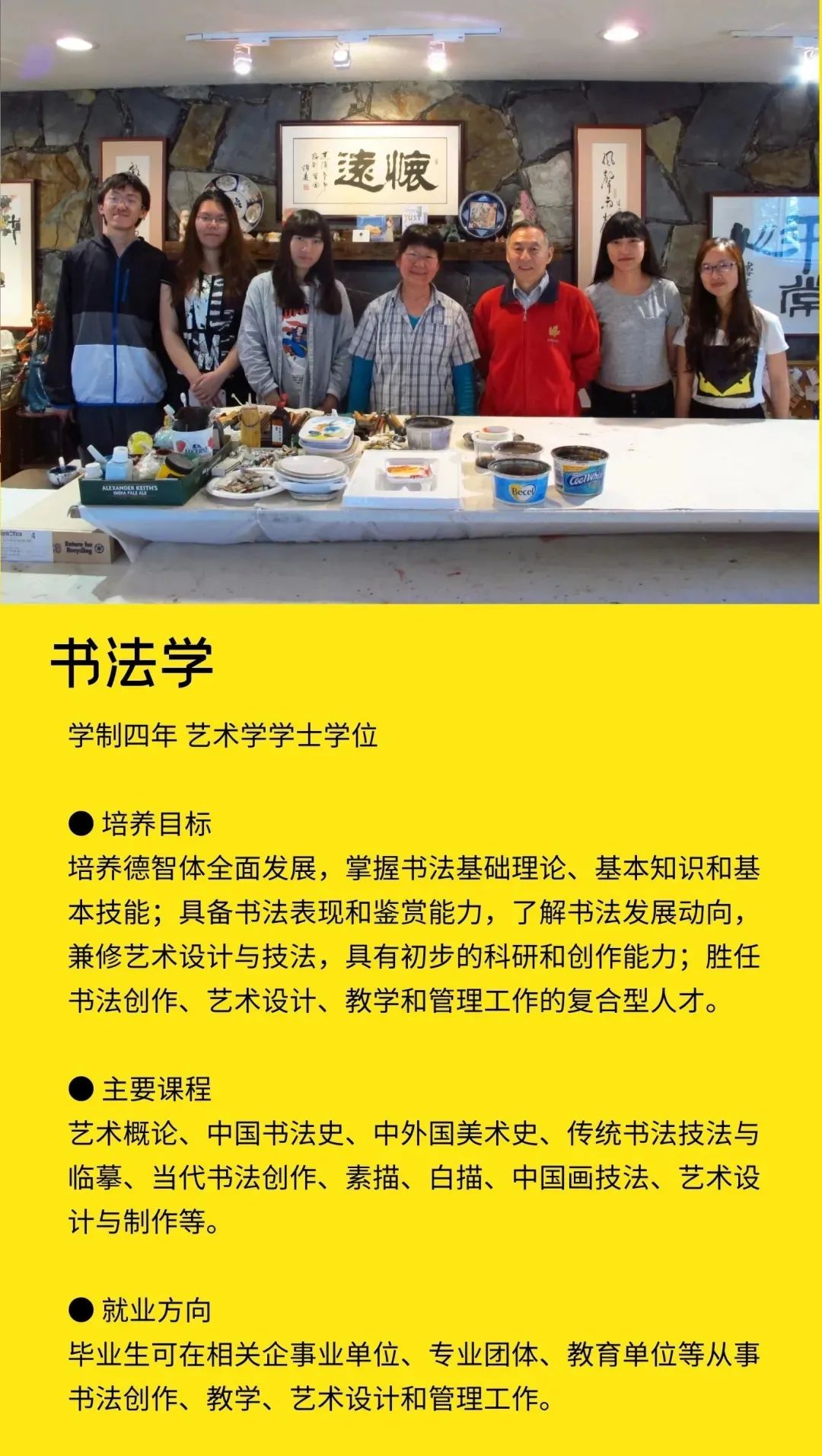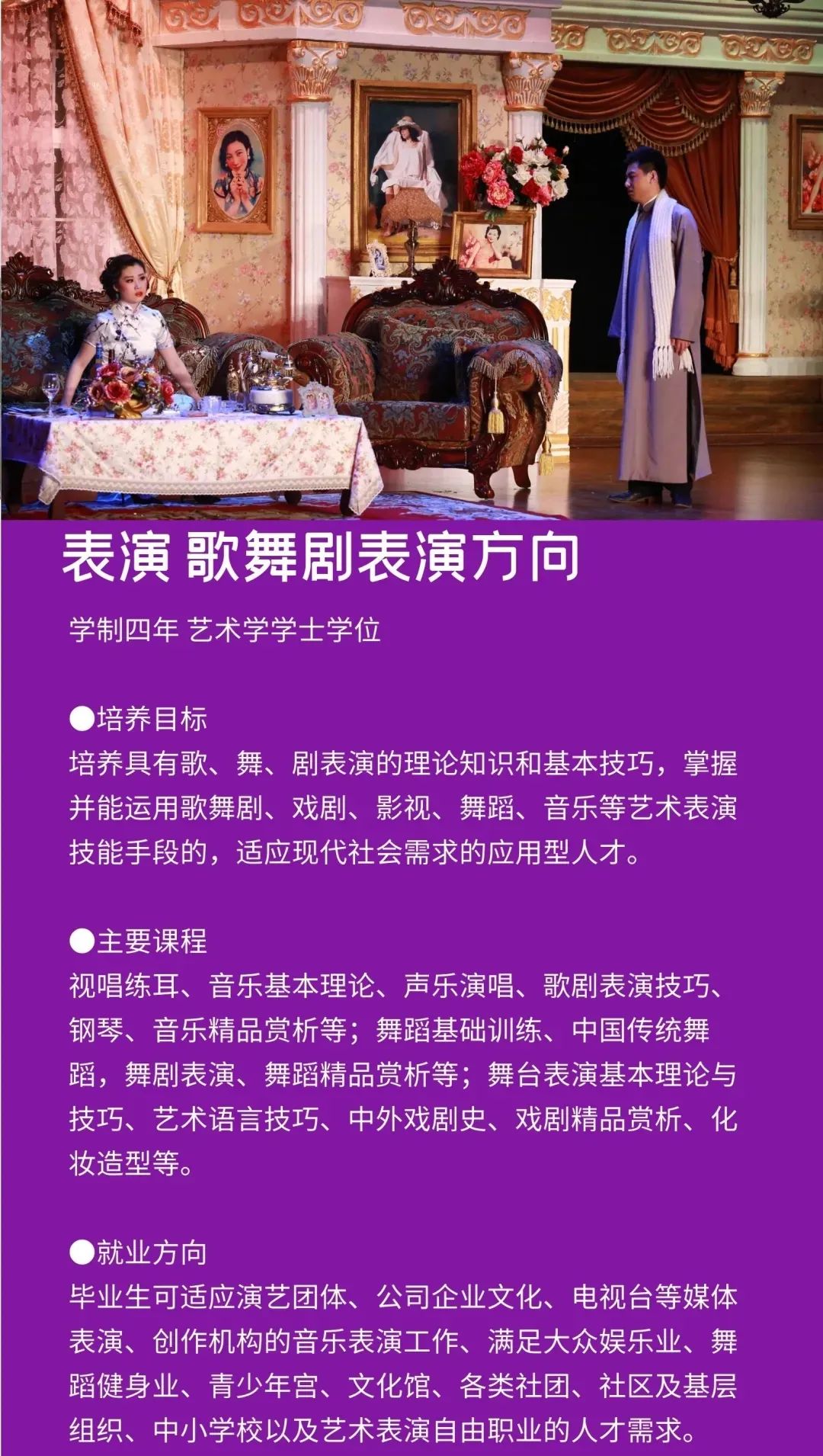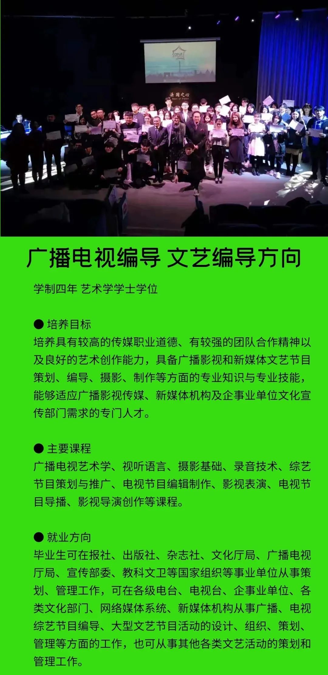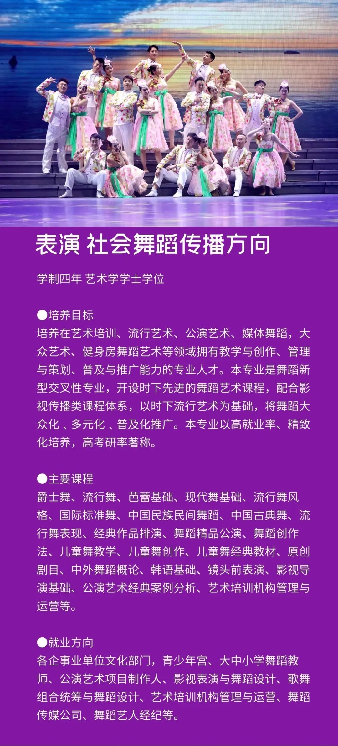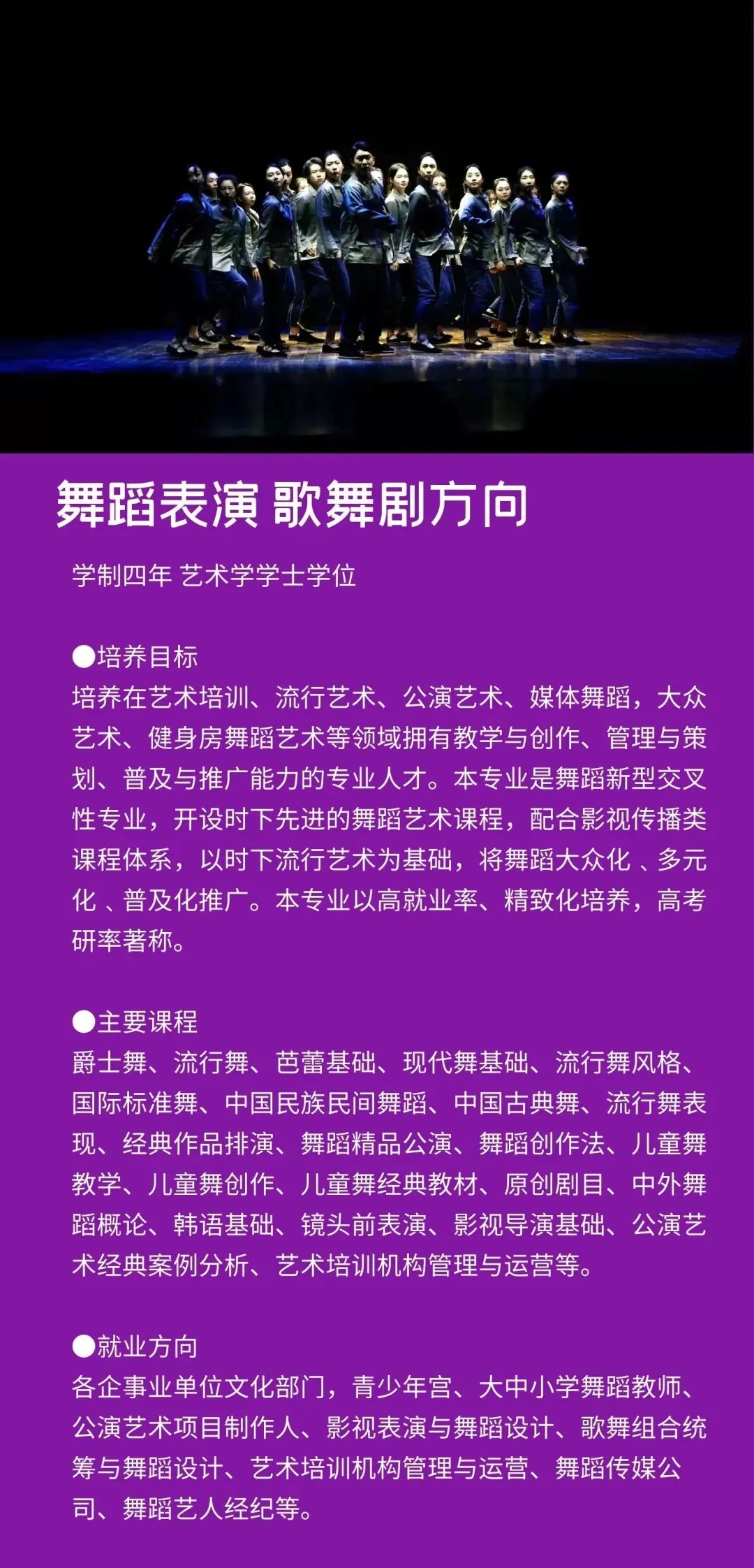 学校定位于打造一所与众不同的艺术院校,以多门艺术学科交叉融合为突破口,设置会展经济与管理、学前教育、广播电视编导、播音与主持艺术、摄影、表演、艺术设计学、视觉传达设计、环境设计、书法学、录音艺术等专业,形成了艺术与现代传媒、数字创意产业紧密融合的专业群,凸显艺术学门类的学科优势。