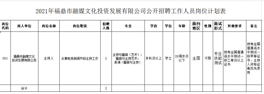 《2021年福鼎市融媒文化投资发展有限公司公开招聘工作人员岗位计划表》