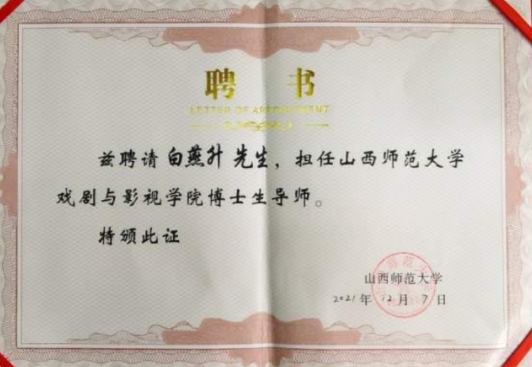 聘请知名主持人、山西传媒学院教授白燕升为该校戏剧与影视学院博士生导师。