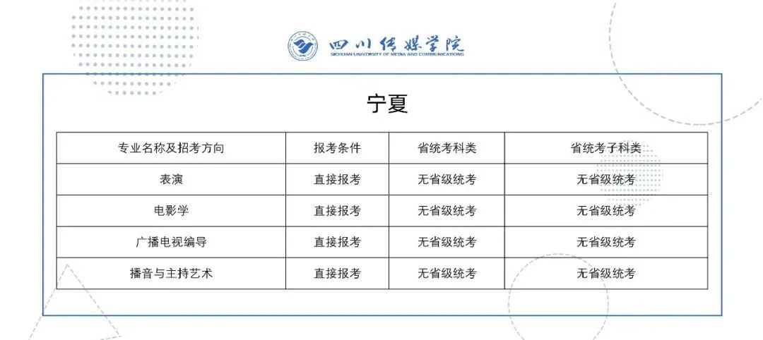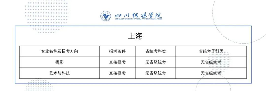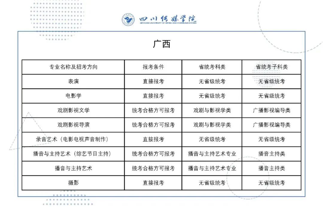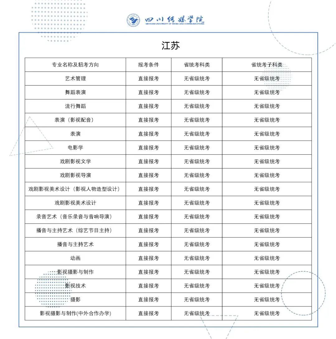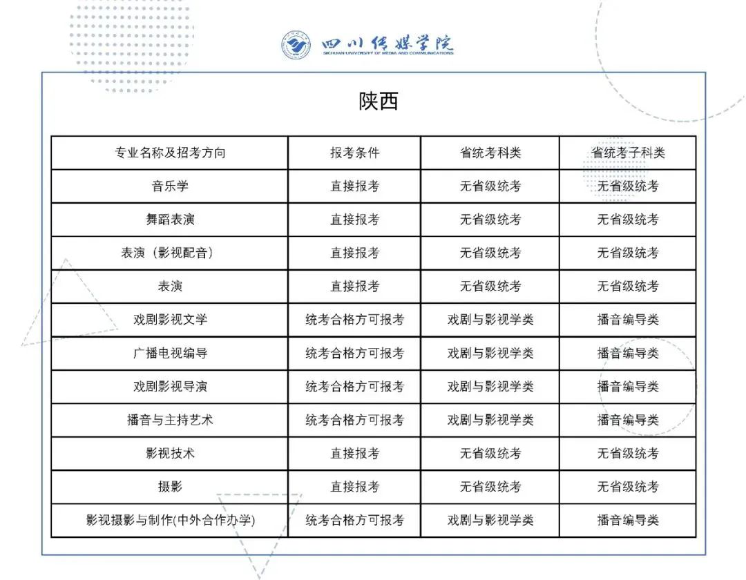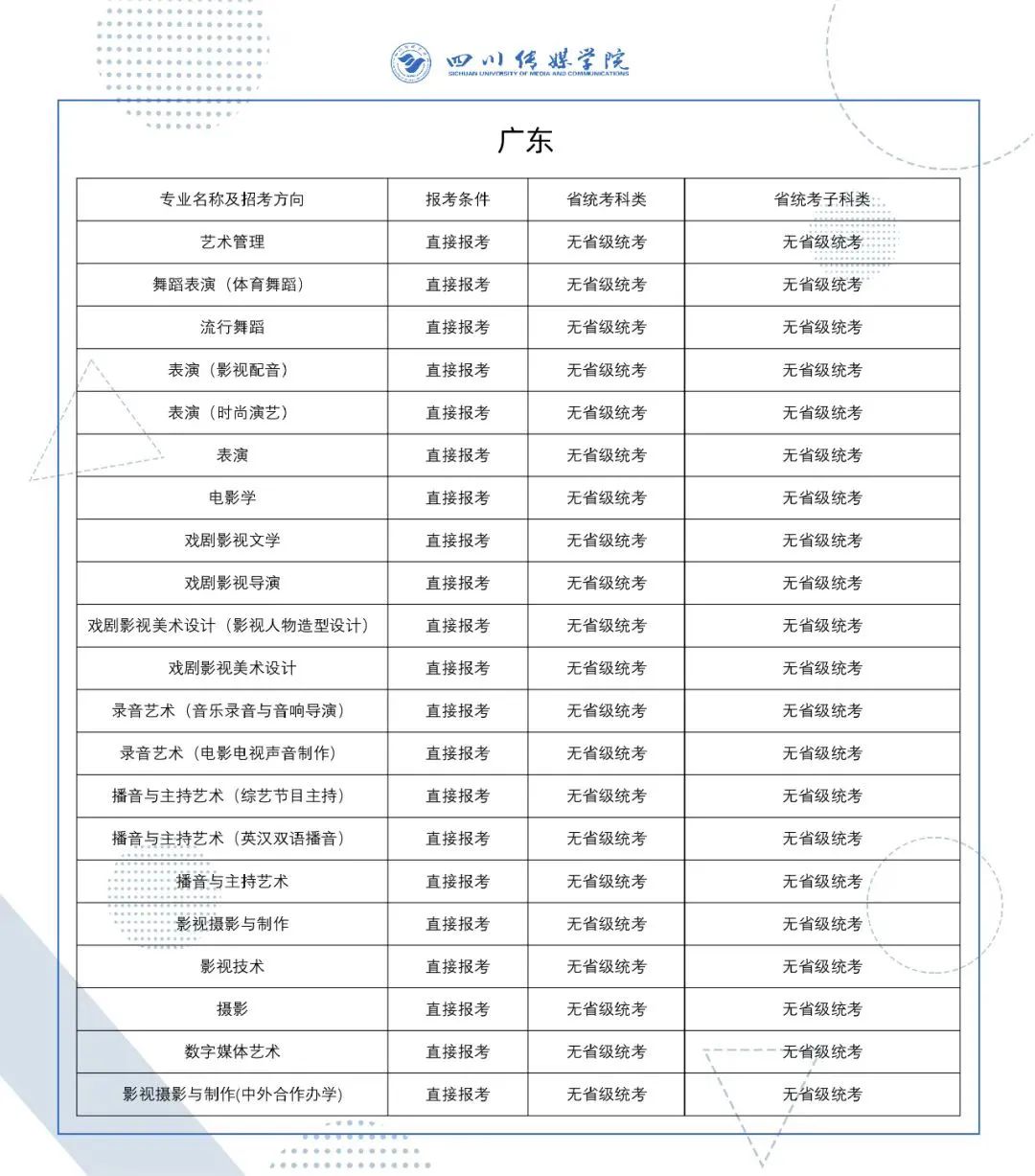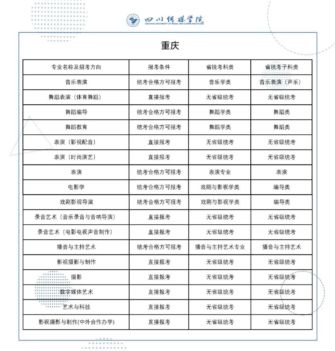 根据教育部办公厅《关于做好2022年普通高等学校部分特殊类型招生工作的通知》(教学厅〔2021〕7号)文件精神,结合学校人才选拔的要求,经与各省(直辖市、自治区)招生考试机构沟通,现将四川传媒学院2022年艺术类校考专业与各省级艺术类统考子科类对应关系公布如下: