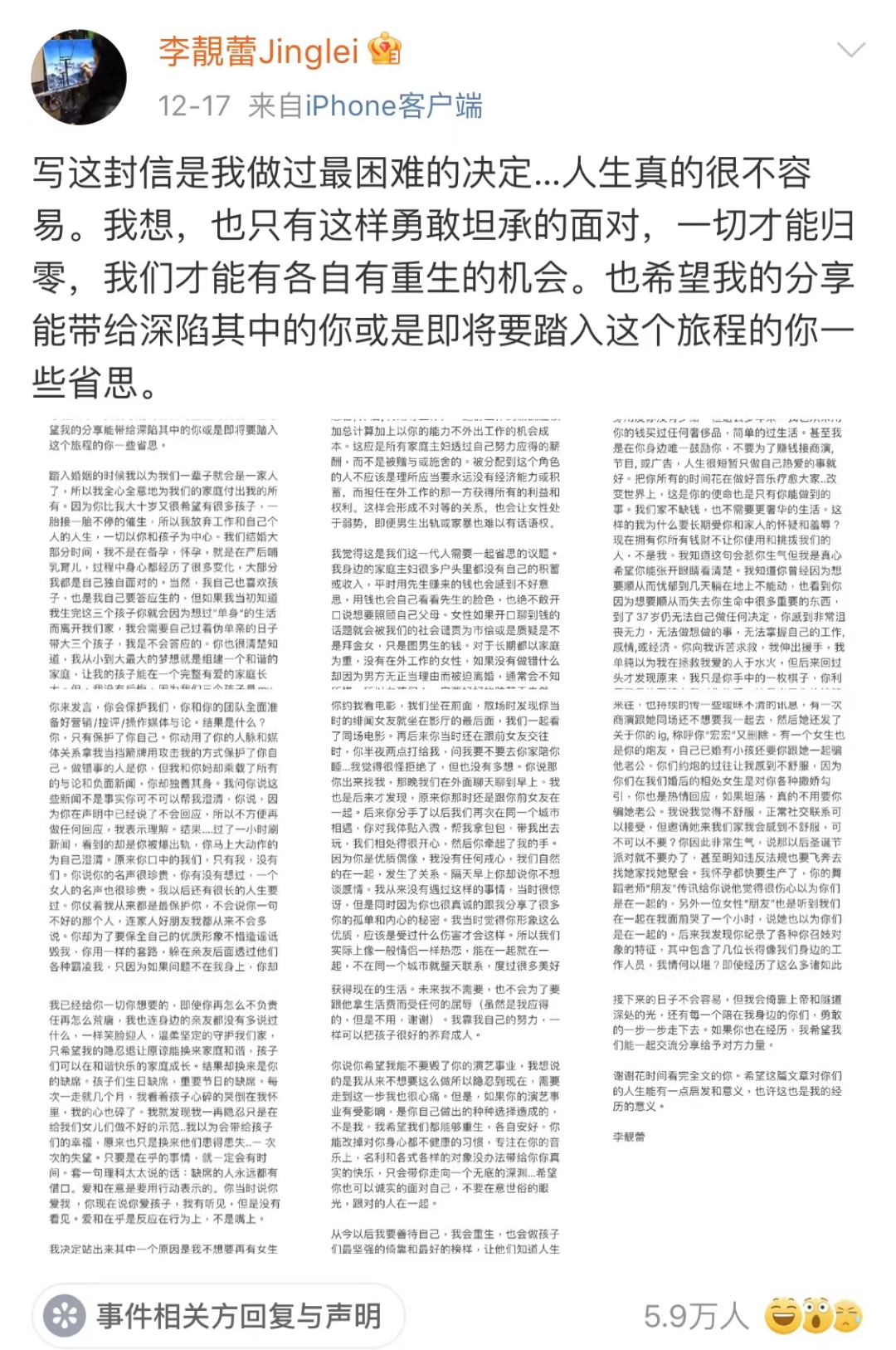 下面就让我们分别来看看两人的发言。首先是李靓蕾的wb截图:
