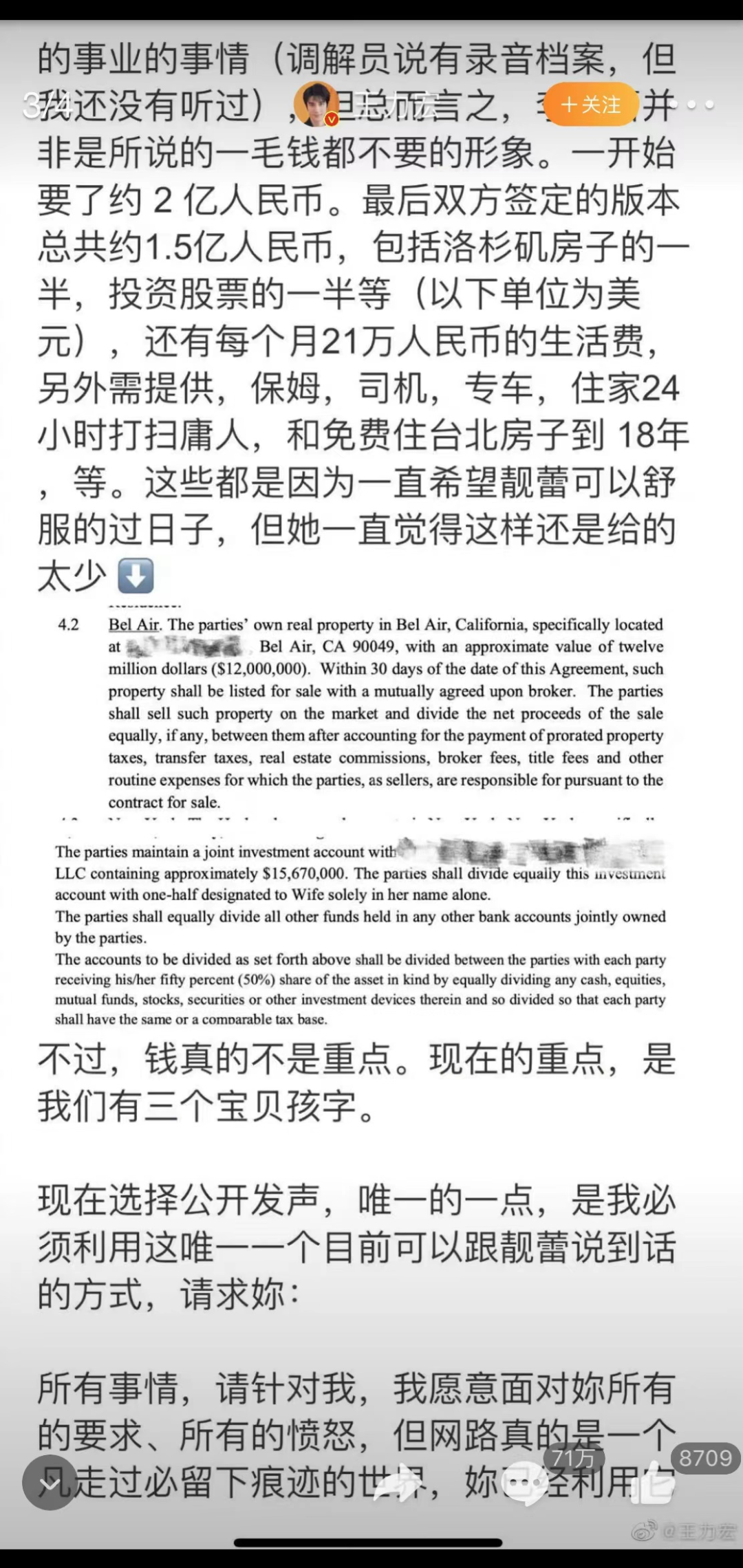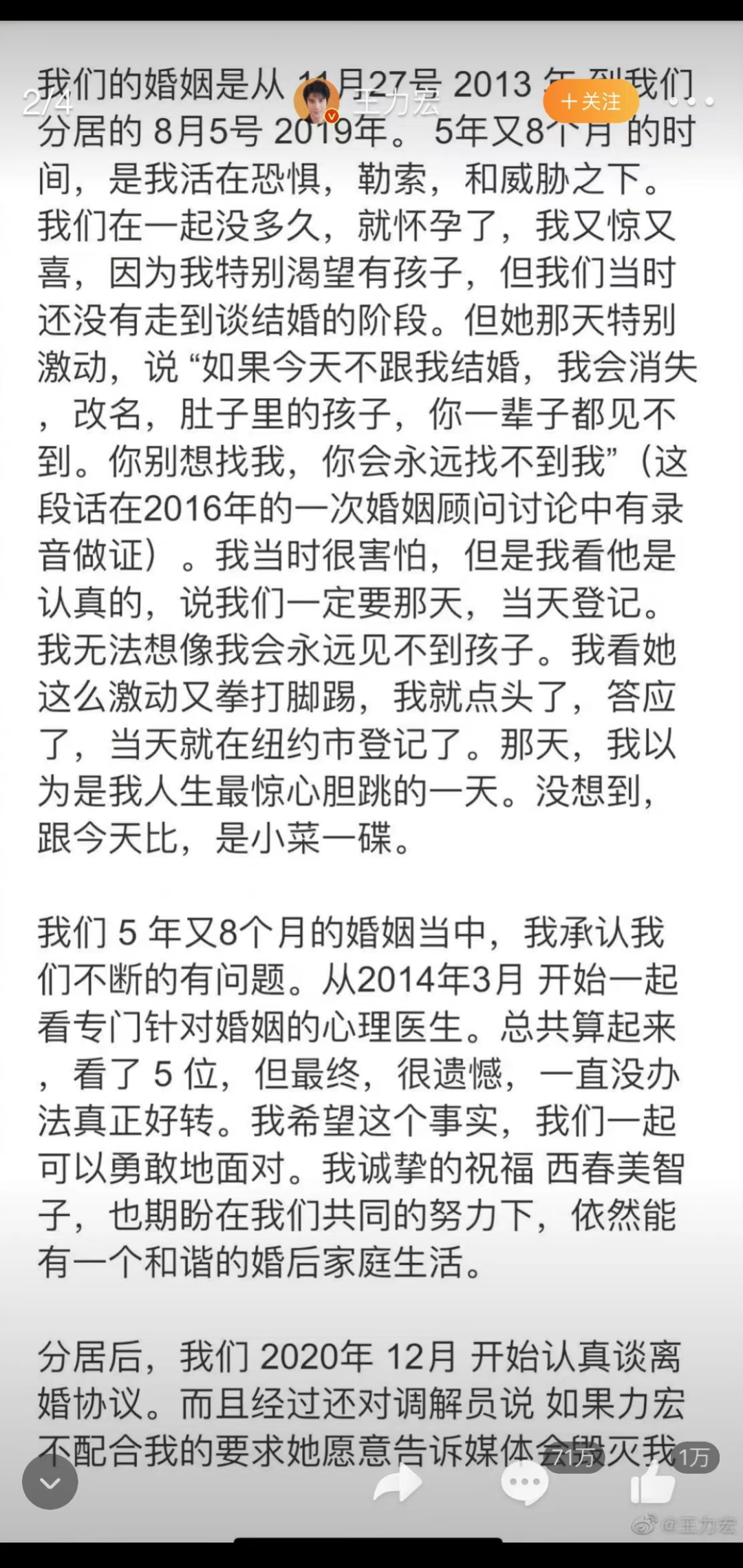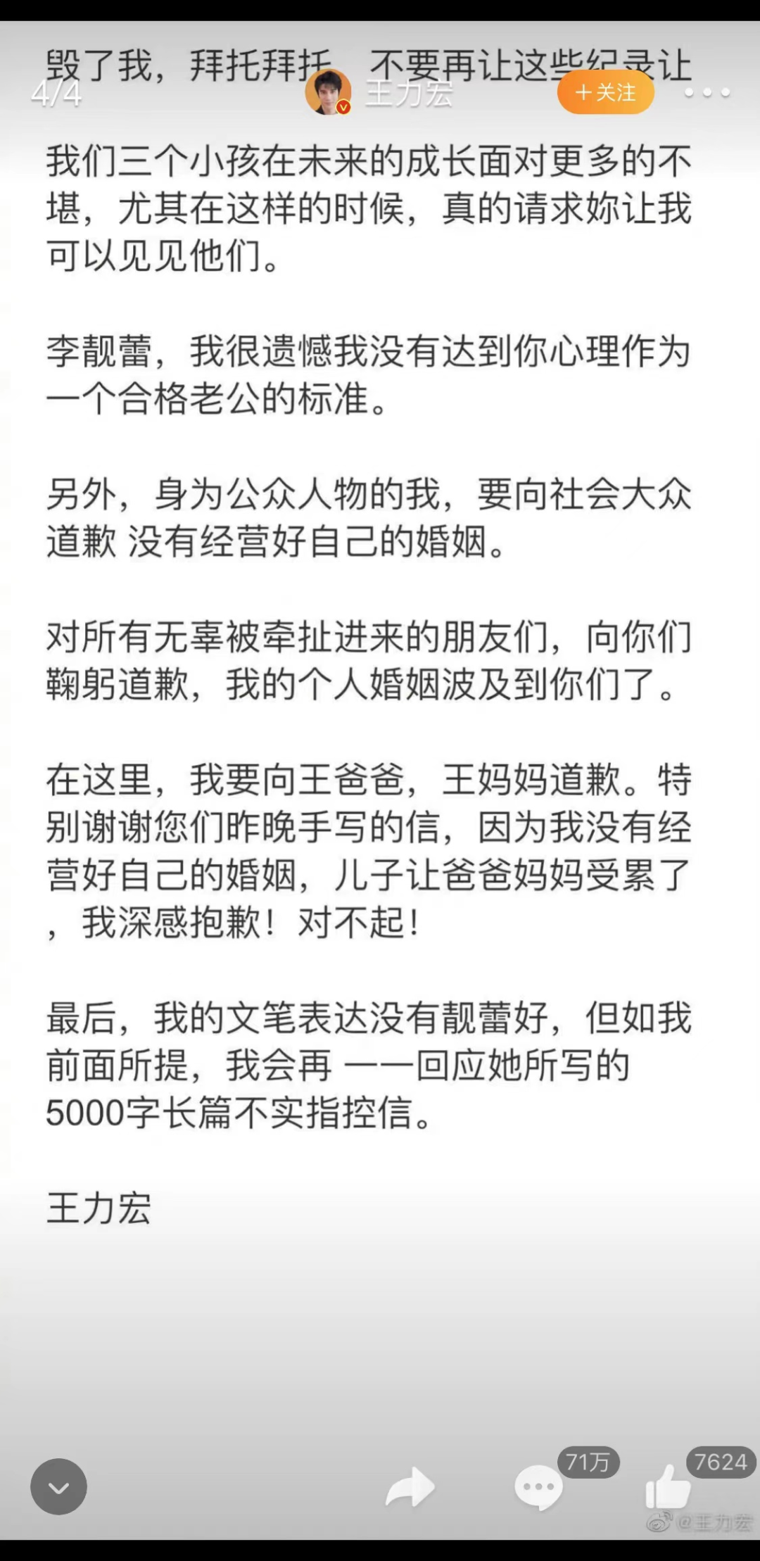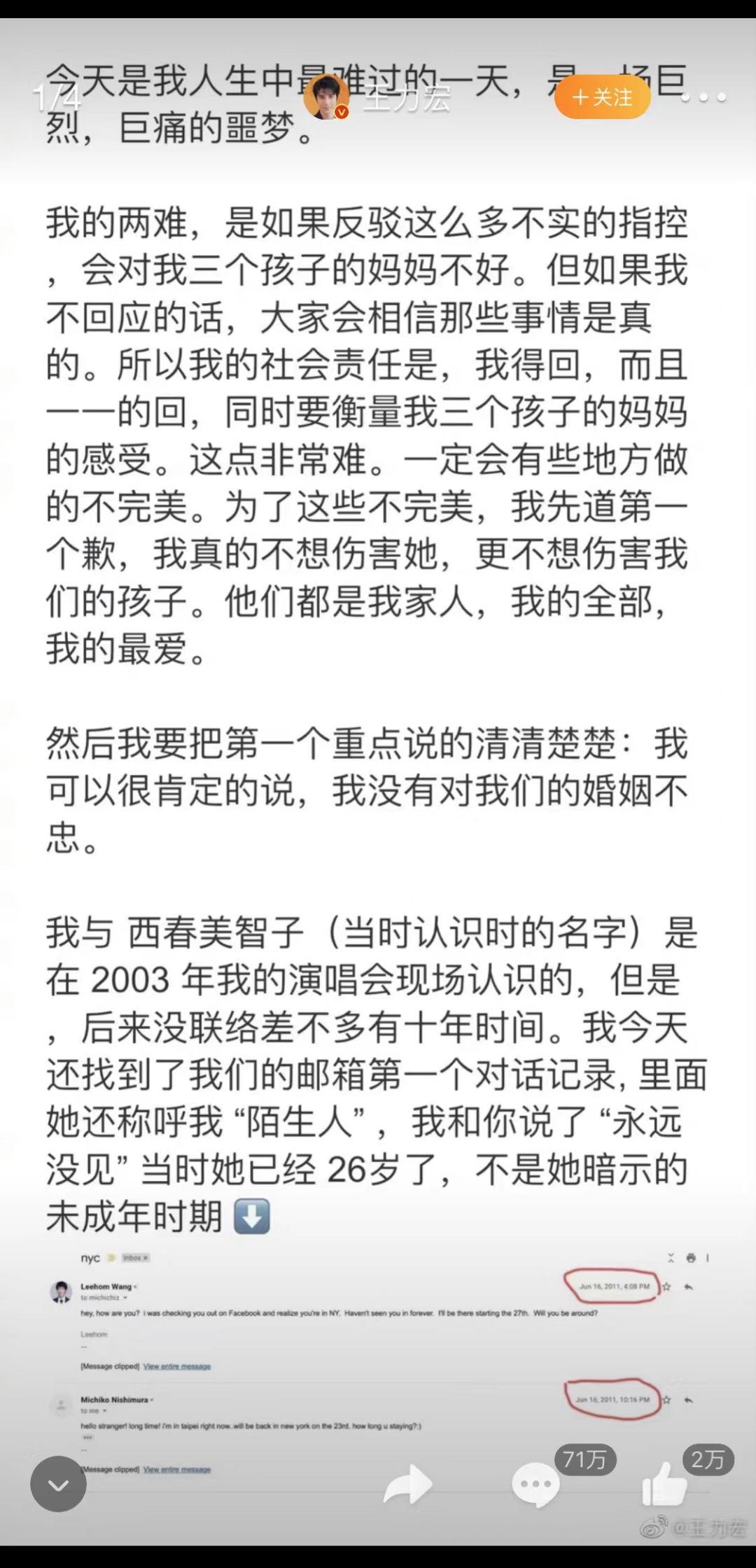 王力宏发出来的文字,不仅看不出他的重点,而且前言不