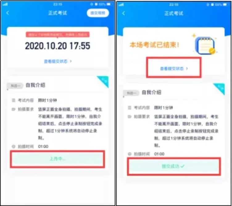 提交后,可以在“查看提交状态”里看到视频上传进度。提交成功或考试时间结束后,考试状态显示已结束。