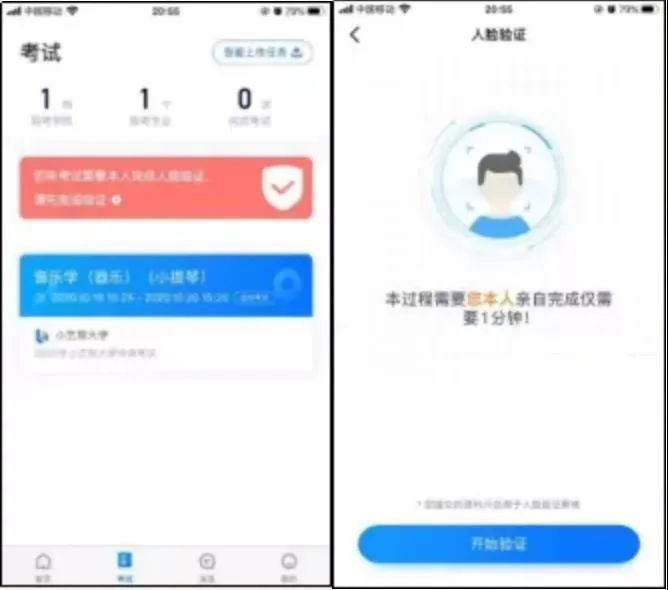 首次视频考试前需要进行人脸验证,注意考试列表屏幕上方红色条,点击开始验证,按提示进行人脸验证,验证完成后方可参加考试;