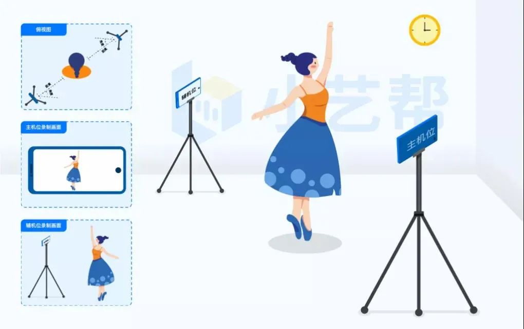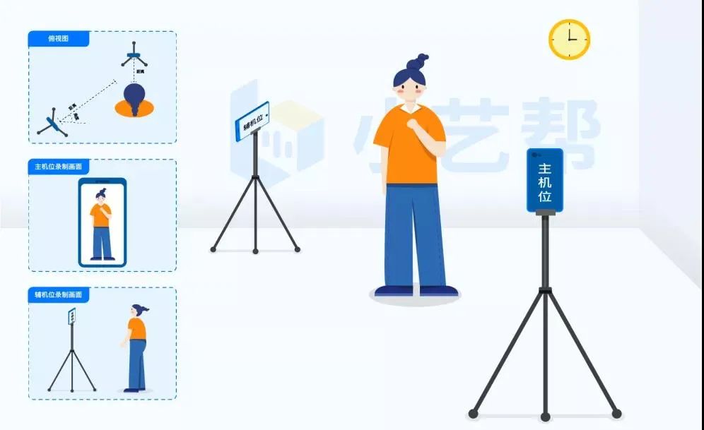 由于考试使用双机位录制,请提前架设好主机(小艺帮APP)和辅机(小艺帮助手APP)(摆放方法参照下方双机位摆放示意图),进入正式考试后,辅机位先扫描主机位二维码,开启辅机位录制,且在规定时间进入各科目录制。