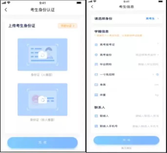 2.选择身份“高考生”,按照指引填写学籍信息,即可完成认证。请务必根据实际情况填写准确。